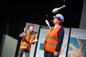 Das AXK-Artistische Xundheitskabarett mit Daniel Morelli ergänzte die Verleihung der Gütesiegel an Oberösterreichische Betriebe durch die OÖGKK. Vom Zahnarzt bis zum Industriebetrieb war alles dabei und die Anwesenden waren voll Elan dabei Ihren Beitrag zum Gelingen der Veranstaltung zu leisten! Sowohl als Pyramidenbaustein in der „Partizipationspyramide“ oder als Assistentin bei der „Kooperationszauberei“! Highlight und Abschluss die fliegenden „Gelingensbedingungen“ mit einer HELDIN in der Mitte.